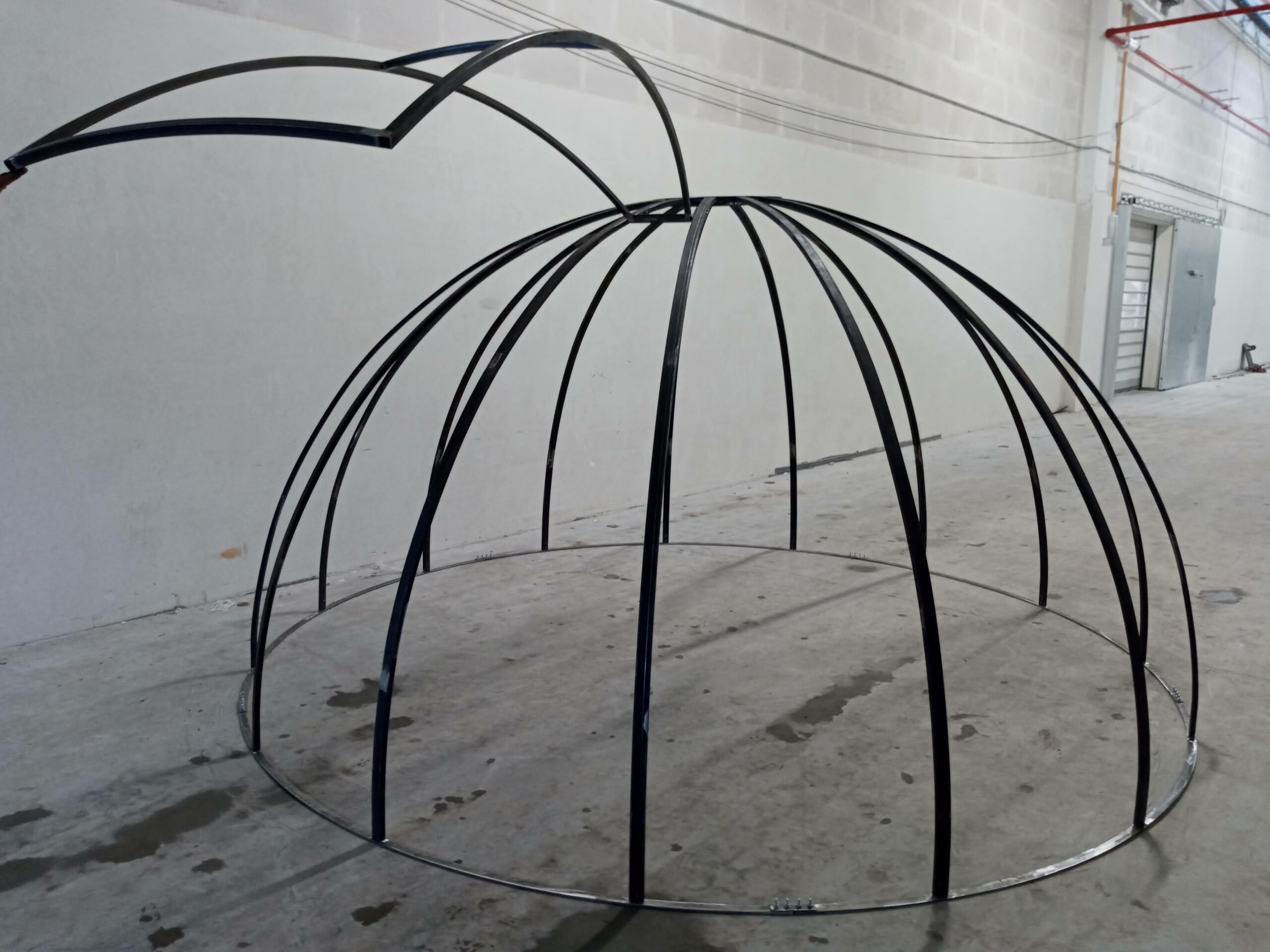Descubra la robusta Estructura Metálica de Cúpula; ideal para invernaderos, observatorios y pabellones de eventos. Cuenta con un diseño ingenieril, acabado en polvo negro brillante y excepcional durabilidad, anclándose de manera segura a su base.