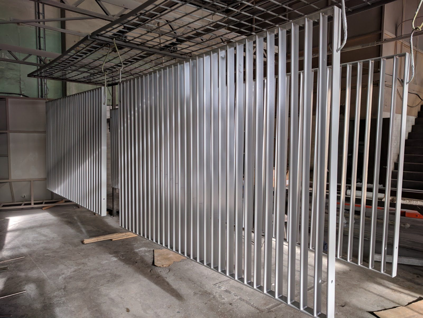 The steel construction, supported by horizontal bars and mounted on sturdy poles, offers excellent durability. Finished with a grind for smoothness and coated in a corrosion-resistant powder, typically in a silver or gray tone like RAL 9006 (White Aluminum), it stands up against environmental elements while maintaining a sleek appearance.